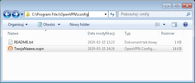 - Jeśli w kroku 3 pozostawiliśmy domyślny folder instalacji, do katalogu C:\Program Files\OpenVPN\config kopiujemy otrzymany wcześniej od działu IT indywidualny plik konfiguracyjny z rozszerzeniem „.ovpn” (Rys.4).